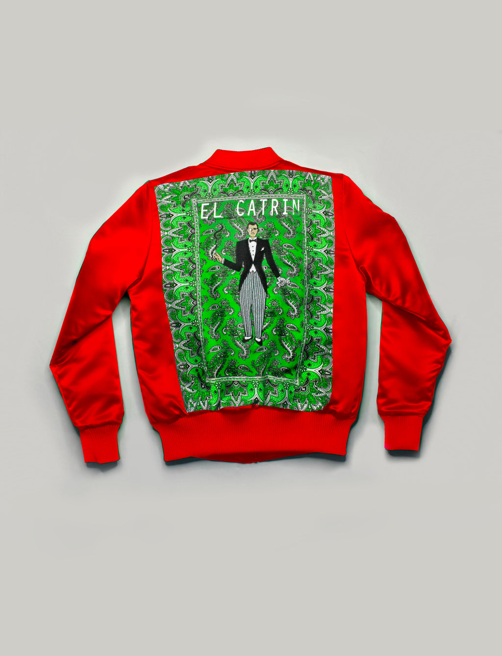 Chamarra tipo bomber con paliacate bordada con la ficha de "El borracho" en parte trasera. Tiene cardigan en pretina, puños y cuello. El corte del bomber no es slim fit, por lo que es más oversize y abombachada.