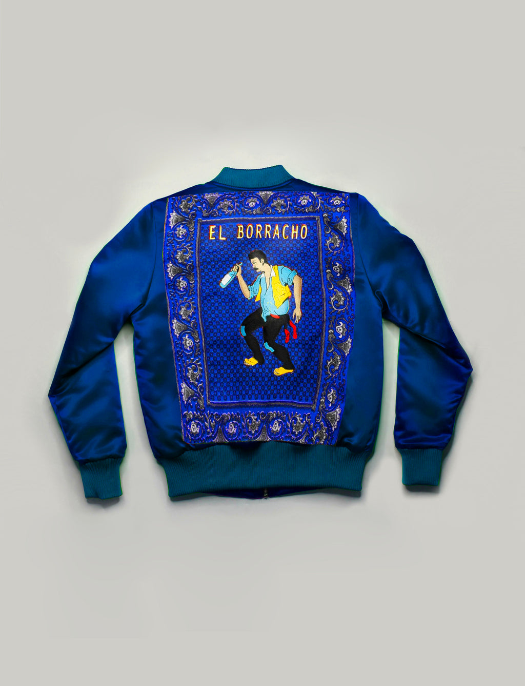 Chamarra tipo bomber color azul rey con paliacate bordada con la ficha de "El borracho" en parte trasera. Tiene cardigan en pretina, puños y cuello. El corte del bomber no es slim fit, por lo que es más oversize y abombachada. ...