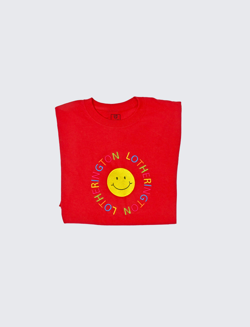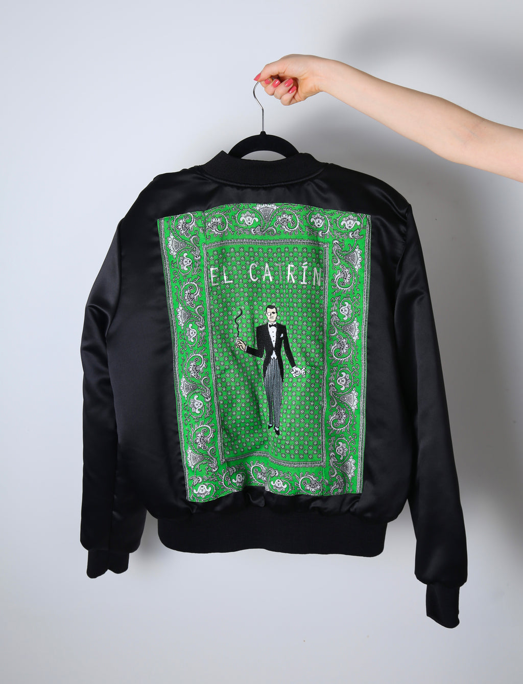 Chamarra color rojo-naranja con pespuntes blancas en las costuras.